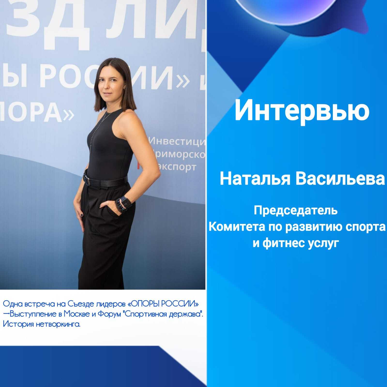Наталья Васильева: Это знакомство стало отправной точкой для долгосрочного и очень плодотворного сотрудничества! Сейчас мы постоянно на связи, у нас отличные рабочие и человеческие отношения. Мы вместе двигаемся в экспертном направлении уже на федеральном уровне. И это сотрудничество дало совершенно конкретные результаты. Например, благодаря поддержке и нашему взаимодействию, мне была предоставлена уникальная возможность – попасть в число участников масштабнейшего форума «Россия - спортивная держава»! У "ОПОРЫ РОССИИ" была квота буквально на 2 человека от всей организации, и одним из них была я.